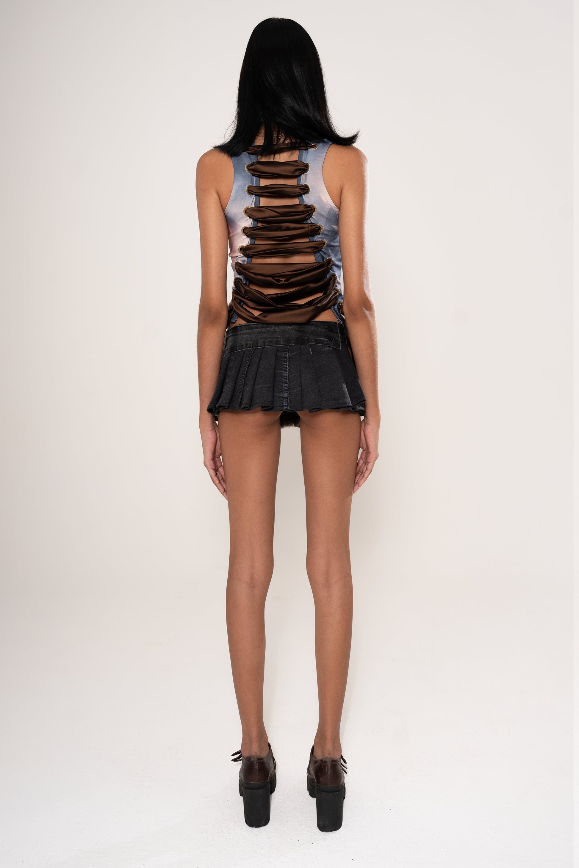 Blusa confeccionada em malha suplex de poliéster. Possui estampa aplicada em alta definição, além de aplicação de ilhoses de metal e amarração com tiras nas costas, garantindo melhor vestibilidade. Modelagem ajustada ao corpo.
